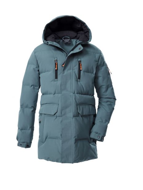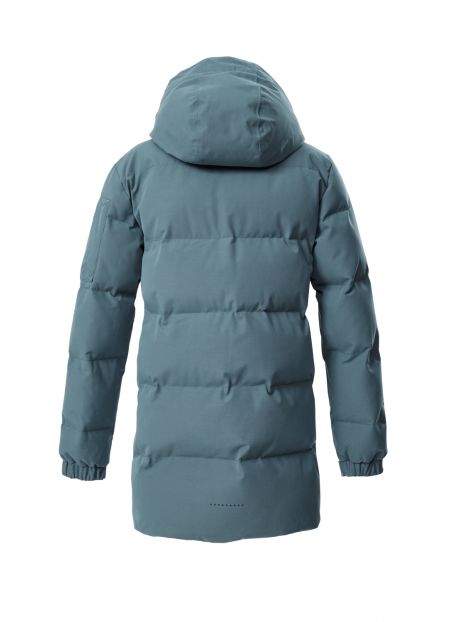 Această parka funcțională de iarnă pentru copii, cu căptușeală groasă, este rezistentă la vânt și hidrofugă, având o coloană de apă de 10.000 mm. Manșetele sunt reglabile cu capse. Fermoarul ascuns cu două direcții poate fi deschis de sus și de jos, asigurând libertatea de mișcare. Protecția pentru bărbie previne ciupirea pielii. Două buzunare laterale, două buzunare la piept și un buzunar la mânecă oferă un spațiu amplu de depozitare. Această parka a fost tratată cu o impregnare fără PFA și este fabricată parțial din materiale reciclate.