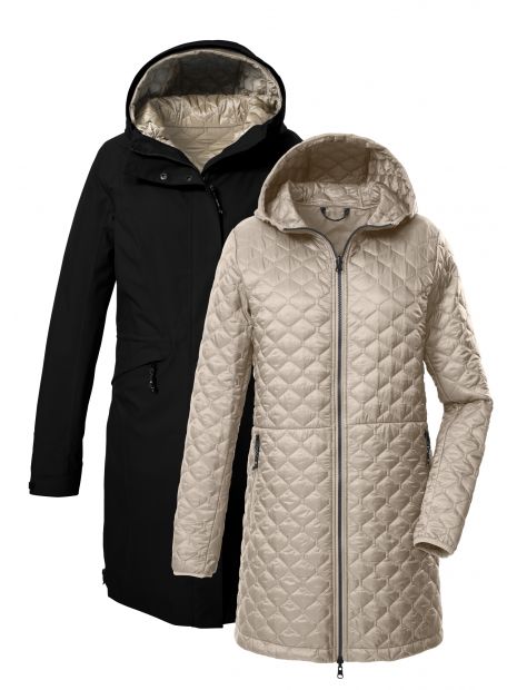 Jacheta funcțională 3 în 1 versatilă de la Killtec este o jachetă universală. Jacheta outdoor are caracteristici funcționale. Cu o coloană de apă de 10.000 mm, un fermoar impermeabil și cusături sudate, este impermeabilă și rezistentă la vânt. De asemenea, este respirabilă (3.000 g/m²/24 h). Gluga este reglabilă. Fermoarul ascuns în 2 căi și fermoarele laterale asigură multă libertate de mișcare. Manșetele pot fi ajustate cu ajutorul velcro. Diverse buzunare oferă spațiu pentru telefonul mobil, chei etc. Un aspect deosebit este jacheta suplimentară matlasată, care poate fi pusă sau scoasă cu fermoar cu ușurință. Acest lucru vă permite să adaptați jacheta în mod flexibil la orice condiții meteorologice. Această jachetă a fost impregnată cu material fără PFAS și este parțial realizată din material reciclat.