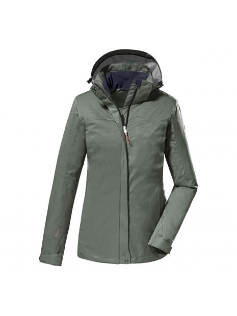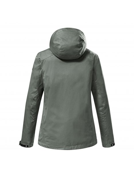 Jacheta funcțională pentru femei de la Killtec protejează în mod fiabil împotriva vântului și a ploii. Este 100% rezistentă la apă și vânt, cu cusături sudate și o coloană de apă de 10.000 mm. Gluga cu fermoar poate fi reglată individual. Manșetele pot fi reglate cu velcro. Fermoarul are o protecție pentru bărbie pentru a preveni ciupirea pielii. Cele două buzunare laterale au fermoare, iar un buzunar interior oferă spațiu suplimentar de depozitare. Această jachetă nu conține PFC.